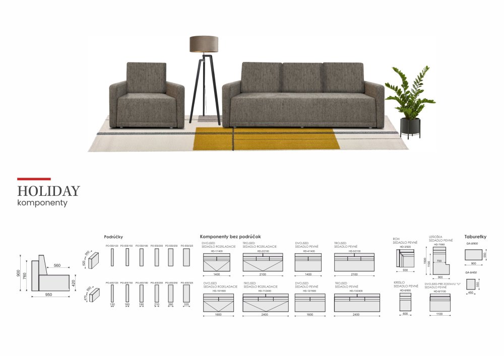 HOLIDAY je moderná kombinovateľná rozťahovacia sedačka. Tento model má k dispozícii viac modulov, a preto je možné kombinovať viacero kombinácií podľa potreby. Na výber je k dispozícii viac ako 200 látok v troch cenových kategóriach. Vnútro sedenia tvorí tzv. pružinový sendvič. Sedačka Holiday ma kvalitnú penu, ktorá zabezpečuje vysokú odolnosť proti preležaniu. Sedačka je ideálna pre relaxáciu v obývacej izbe.